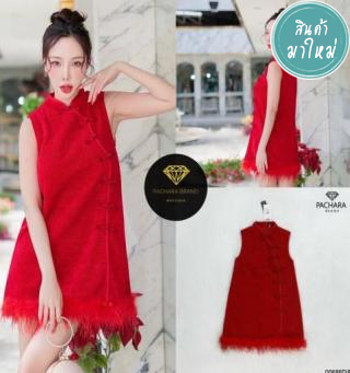 เดรสสั้นคอจีนแขนกุดทรงปล่อยสีแดง แต่งกระดุมผ้าด้านหน้า