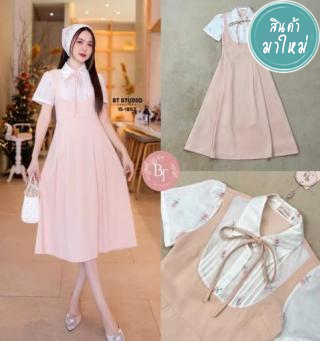 ชุดเดรสดีเทลแต่งต่อ คอปกสีขาวแต่งจับจีบกลางอกทั้งสองข้างพิมพ์ลายดอกไม้