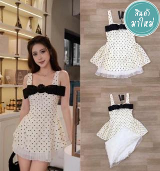 เดรสสายเดี่ยวลายจุดทรงเข้ารูป อกแต่งโบว์สีดำใหญ่สะดุดตา