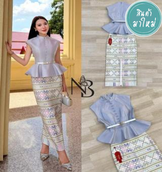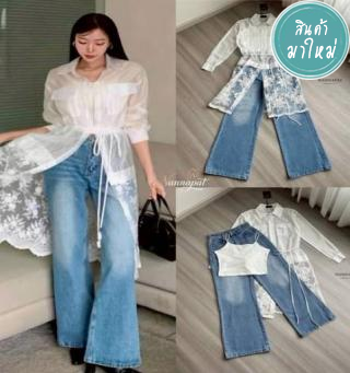 ชุดเซ็ต 3ชิ้นเสื้อแขนล้ำแต่งกระดุมด้านหน้า ชายเสื้อเป็นทรงระบายงานซิปหลัง