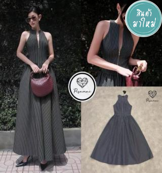 เดรสสีดำแขนกุดลายทางทรงรูดซิปหน้าสวย หรู ลูกคุณมากๆค่า
