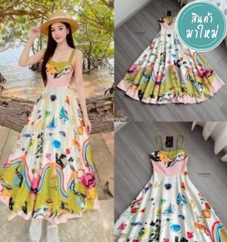 เดรสยาวสายเดี่ยวทรง A-line สไตล์ Resort Wear โดดเด่นด้วยลายพิมพ์กราฟิกงานอาร์ต