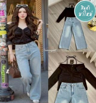 เสื้อแขนตุ๊กตากับกางเกงขาบาน ตัวเสื้อคอบัว ซิปหลัง