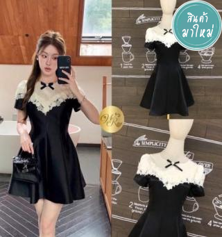 เดรสแขนสั้น อกแต่งลูกไม้ อกเย็บโบว์เพชร ซิปหลัง เนื้อผ้าเรียบ สีพื้น