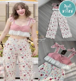 เซท 3 ชิ้น เสื้อครอปลูกไม้ ดีเทลแต่งตะขอด้านหน้า อกเสริมฟองน้ำ