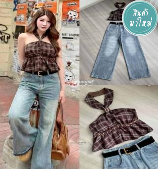เสื้อครอปคล้องคอ (Halter Neck) ลายสก็อตโทนสีน้ำตาลคลาสสิก