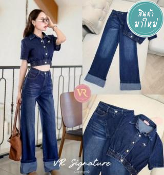 Set เสื้อครอปยีนส์คอปก ติดกระดุมเรียงด้านหน้า