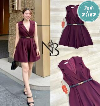 จั้มสั้นสีแดงไวน์ ดีไซน์คอวีทรงปล่อย แต่งกระเป๋าช่วงอกและเย็บจีบช่วงขา
