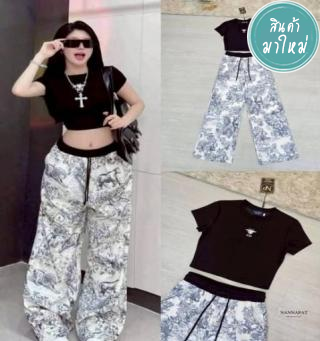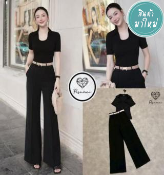เซ็ตเสื้อยือคอกลมแต่ฝดีเท็ลย่นสีดำ