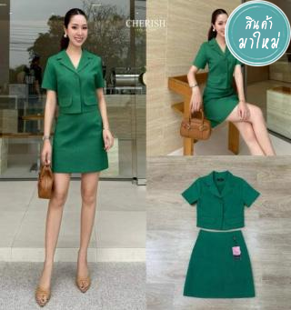 ชุดเซ็ท 2 ชิ้น เสื้อสูทแขนกุดคอปก แต่งกระดุมเงิน มีกระเป๋าหน้า 2 ข้าง