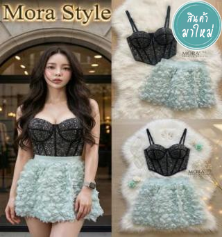 Set2ชิ้น สีดำทั้งชุด เสื้อแขนสั้นคอกลม แต่งผ้าลูกไม้จับจีบเป็นโบช่วงอก