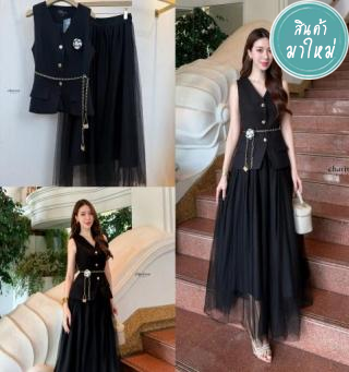 ชุดเซ็ท เสื้อกั๊กแขนกุดตกแต่งกระดุม เข้ารูป
