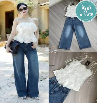 เซ็ตเสื้อกล้ามสีขาวคู่กับกระโปรงยีนส์ปักโลโก้ พร้อมเข็มขัดและเข็มกลัดเข้าเซ็ต