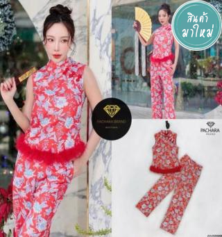 เซ็ต 2 ชิ้น เสื้อคอจีนแขนกุดสีแดง พิมพ์ลายดอกไม้ ชายเสื้อแต่งขนนกแท้
