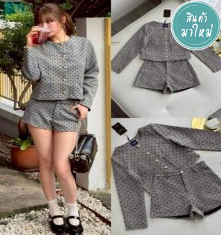 ชุดเซตลายจุด เซตสีดำลายจุดขาว เนื้อผ้าสวย ด้านหน้าแป๊กตัวใหญ่สามจุด