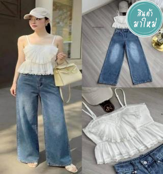 Set เอี๊ยมยีนส์ขายาว ช่วงสายแต่งผ้าลูกไม้ แต่งกระเป๋าช่วงอก
