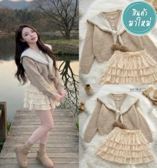 เซ็ต 3 ชิ้น เสื้อแขนยาวแต่งคอปกฉลุลูกไม้ + เสื้อกั้กไหมพรมตัวนอกแต่งดีเทลกระดุมน่ารัก