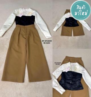 เซท 3 ชิ้น เสื้อแขนยาวคอปกดีเทลผ้าทูโทนสีครีมตัดดำ