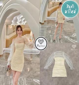เดรสเกาะอกสีครีมแต่งผ้าแก้วแขนพองฟูช่วงไหล่และแขน สวยฟูฟ่อง