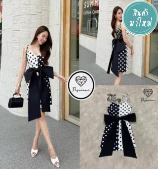 เดรสสายเดี่ยวทูโทนขาวดำลายจุดมาพร้อมกับโบว์เข็มขัดใหญ่แยกชิ้น