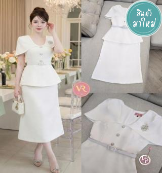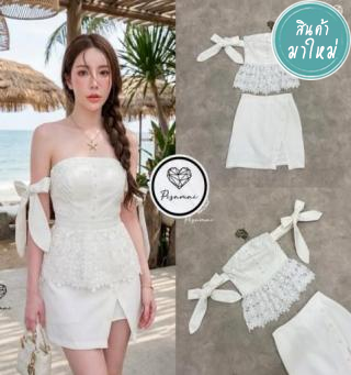 เดรสเกาะอกสีขาวแขนโบว์งานลูกไม้ฉลุ มาคู่กับกระโปรงสอบตัวสั้นสีขาว