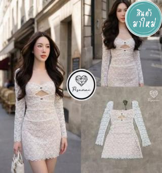 เดรสแขนยาวตัวสั้นสีขาวเว้าเอว ซีทรู งานฉลุลูกไม้ทั้งตัว เรียบ หรู ดูแพง