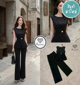เซ็ตเสื้อแขนกุดสีดำช่วงเอวแต่งอะไหล่ทอง มาคู่กับกางเกงขายาวผ้าสูทอัดกาวอย่างดี