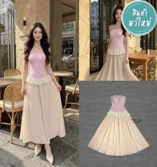 ชุดเดรสยาวสีชมพูครีม ผ้าเนื้อนิ่มใส่สบายผ้าพริ้วสวย