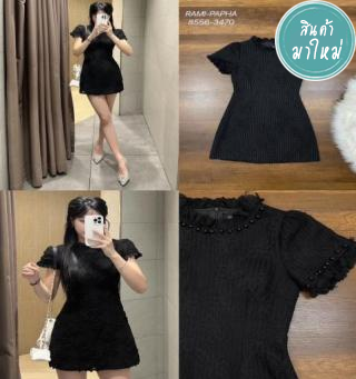 มินิเดรสสีดำแต่งโบว์+ลูกไม้ขาว คอกลมแขนสั้น