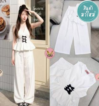 เซ็ตเสื้อคอปสายเดี่ยวสีขาว มาคู่กับกางเกงยีนส์ปักคริสตัลหัวใจ3D แซ่บๆ
