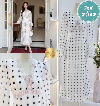 แม็กซี่เดรสตัวยาว แขนยาว คอวี แต่งขอบลูกไม้ ซิปหลัง