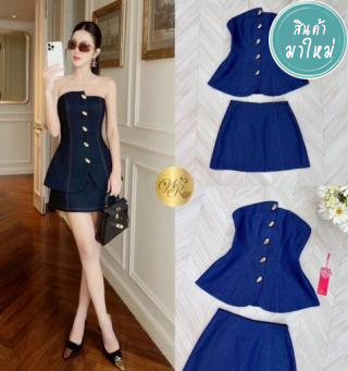 Set เสื้อเกาะอกกับกระโปรงสั้น เสื้อกระดุมทอง กระโปรงเอวสูง