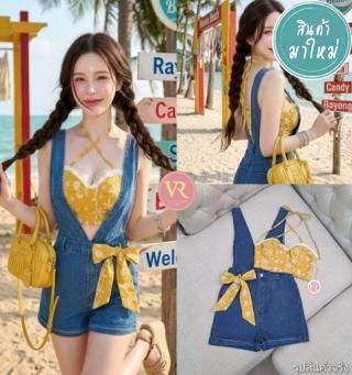 เอี๊ยมยีนส์ขาสั้น มาพร้อมเสื้อครอปผูกคอ แต่งขอบลูกไม้