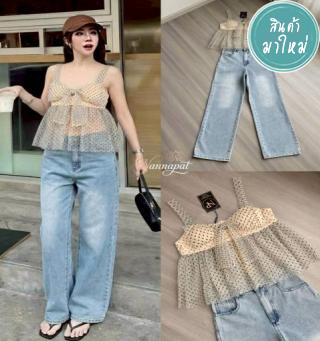 Set เสื้อสายเดี่ยว แต่งเว้าช่วงอกแต่งระบายลูกไม้ ผูกโบว์ด้านหน้า