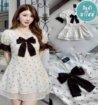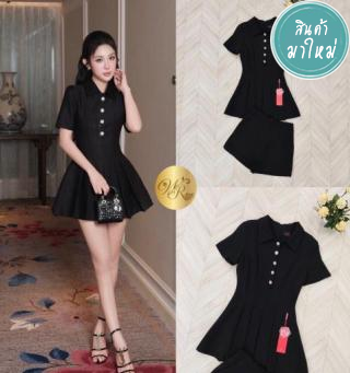 มินิเดรส+กางเกงขาสั้น ตัวเดรสคอปก แขนสั้น อกติดกระดุมเพชร ชายเดรสเย็บจีบ ซิปหลัง