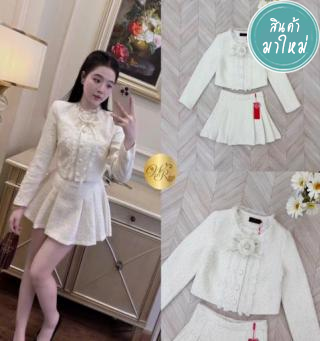เสื้อแขนยาวกับกระโปรงสั้น อกมีเข็มกลัดดอกไม้ เสื้อแแต่งลูกไม้