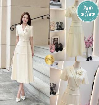 เดรสยาวตัวสวยทรงดี ตัวเดรสมาในผ้าเรียบเนื้อสวย คอปกเชิ๊ตแต่งดอกไม้สวย