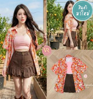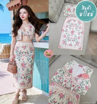 Set 2 ชิ้น เสื้อสายเดี่ยวผ้ายืดหยุ่นเนื้อดี แมทช์กับเสื้อคลุมตัวสั้นลายดอก