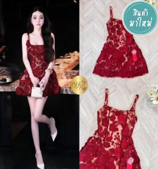 เดรสสายเดี่ยว คอเหลี่ยม เนื้อผ้าลูกไม้ เย็บดอกไม้ป๊อปอัพมาทั้งตัว