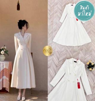 เดรสสูทตัวยาวสวยทรงเก๋ ท่อนแขนยาว ด้านหน้าแต่งกระดุมสีทอง คอปกสวย