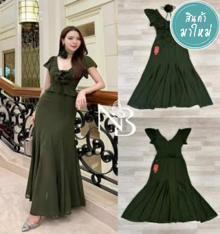 แม็กซี่เดรสแขนกุด มีเข็มกัดดอกไม้2ดอก ซิปหลัง เนื้อผ้าเรียบ สีพื้น