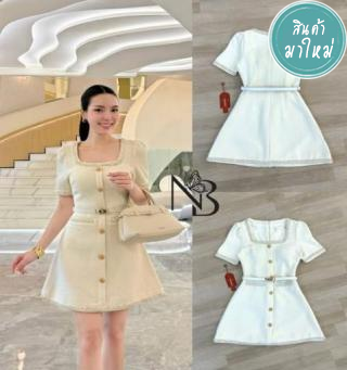 เดรสแขนสั้นผ้าทวิตทรงกระโปรงบาน ดีไซน์แต่งเพรช แต่งกระดุมสีทองด้านหน้า