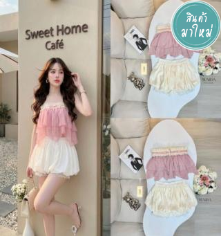 ชุดเซต2ชิ้น เสื้อเกาะอกสีชมพูโน๊ตแต่งโบด้านหน้า