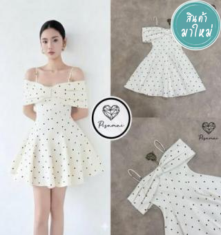 เดรสแขนกุดตัวสั้นสีครีมลายจุด polkadot จุดทรงเปิดหัวไหล่
