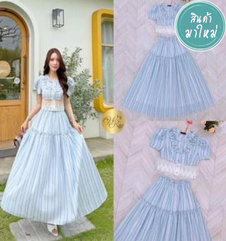 Set เสื้อแขนสั้นกับกระโปรงยาว คอเสื้อเย็บแต่งขอบระบายเล็กๆ