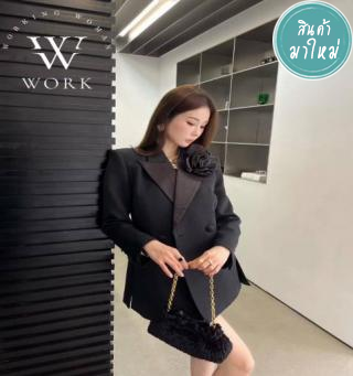 เซตสูทผ้าเครปกึ่งเงาแต่งเข็มกลัดดอกไม้+กระโปรงผ้าซาติน