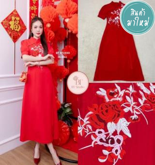 เดรสยาวคอจีนแต่งแขนพอง ๆ ทั้งสองข้าง แต่งกระดุมเรียงกันช่วงอก