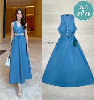 เดรสยาวแขนกุดผ้ายีนส์ทรงสวยดีไซน์คอวีแต่งกระดุมด้านหน้า