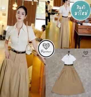 เซ็ตเสื้อผ้าร่องคอปกแต่งชิป มาคู่กับกระโปรงตีเกร็ดช่วงกระเป๋าสีน้ำตาล