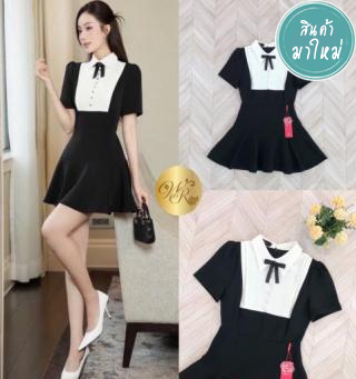 ขนสั้น คอปก โบว์ดำ อกไข่มุก ซิปหลัง เนื้อผ้าเรียบ สีพื้น